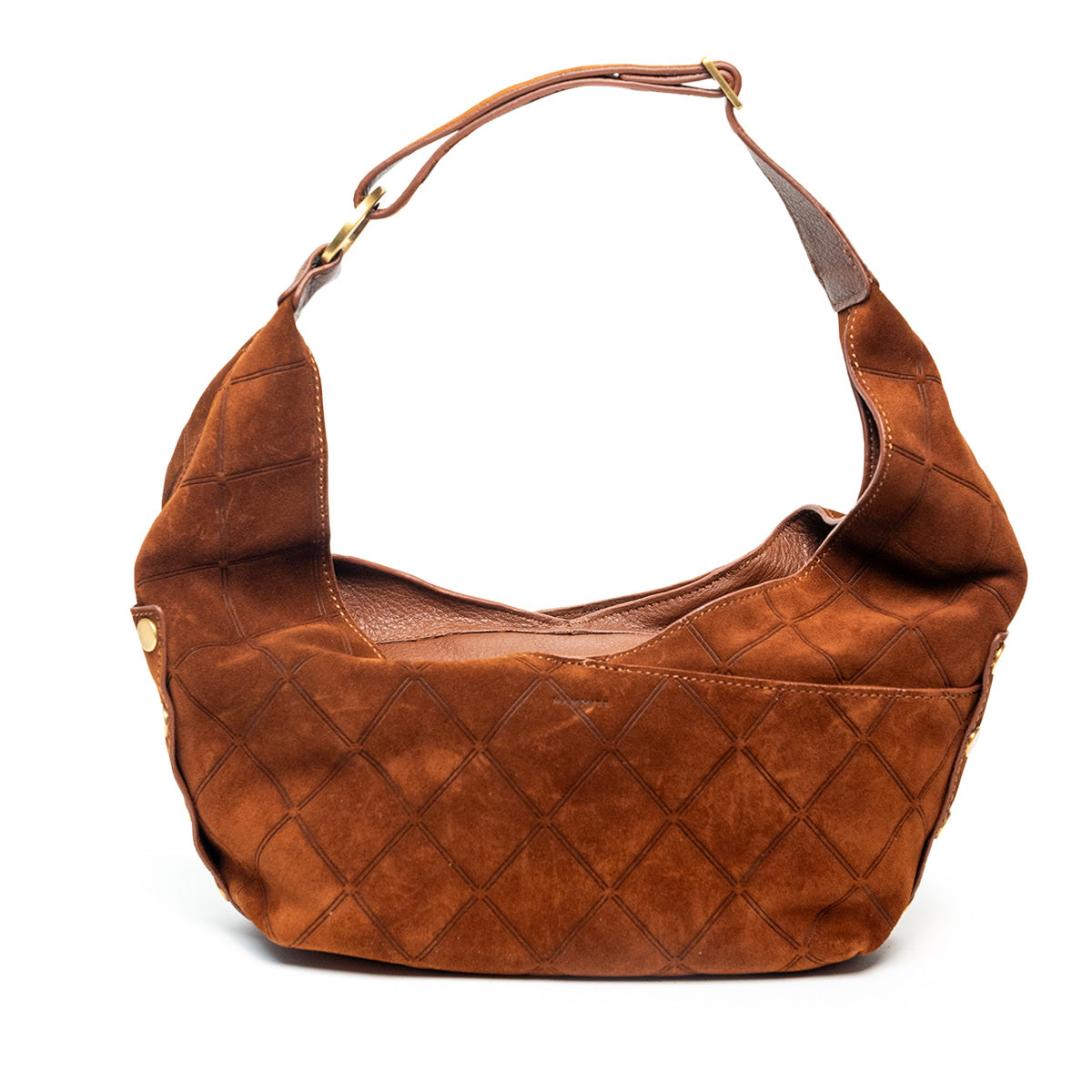 - Exterior: side panels, crisscross drop pockets on front and back panels, adjustable shoulder strap with large O ring, slit detail sides of bag, zippered main compartment
