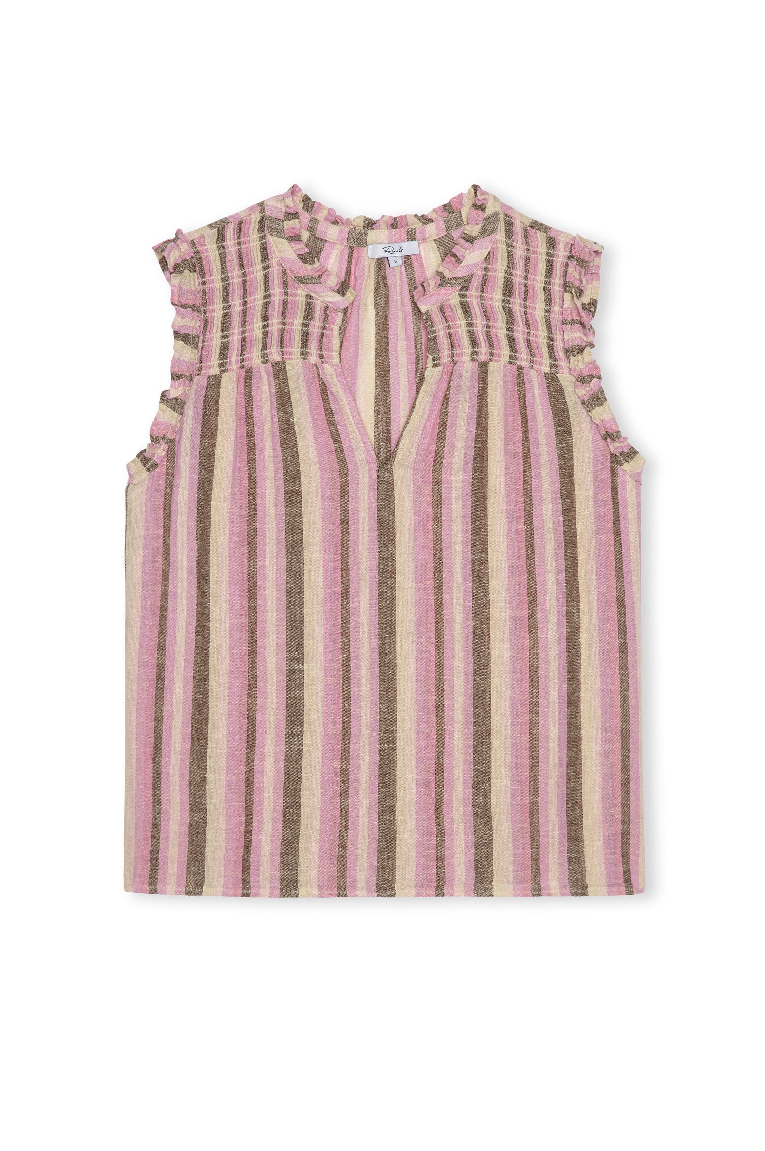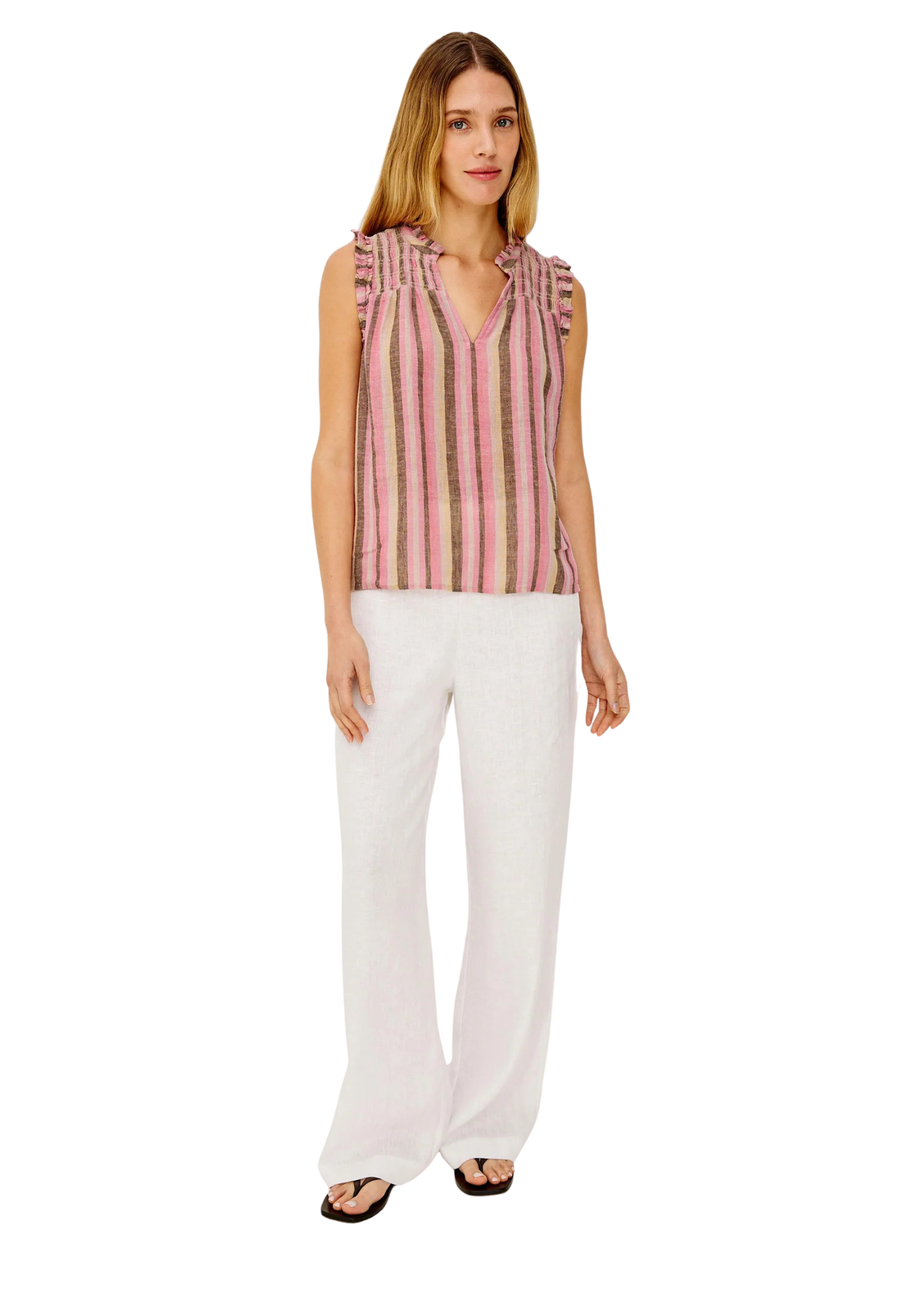 The Arlene Top is crafted from luxe, lightweight linen, with a loose fit, ruffled split band V-neck, sleeveless design, smocked shoulders, and all-over diamond eyelet embroidery.