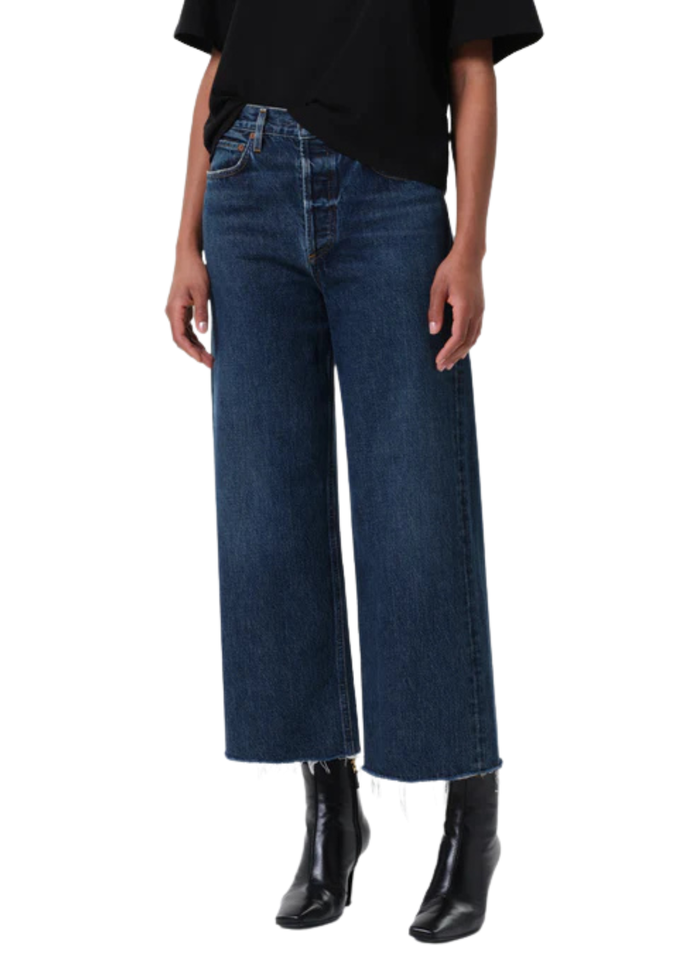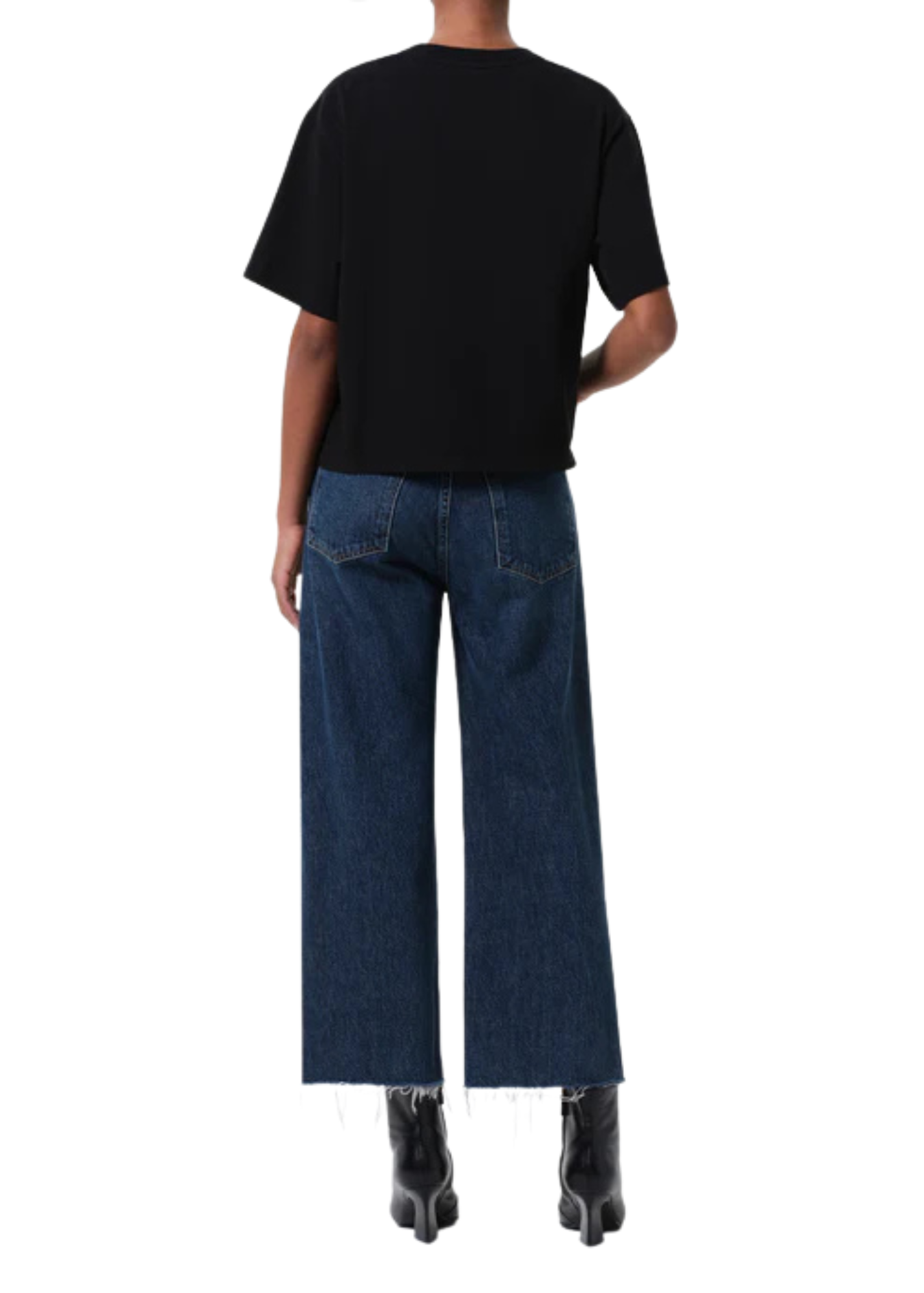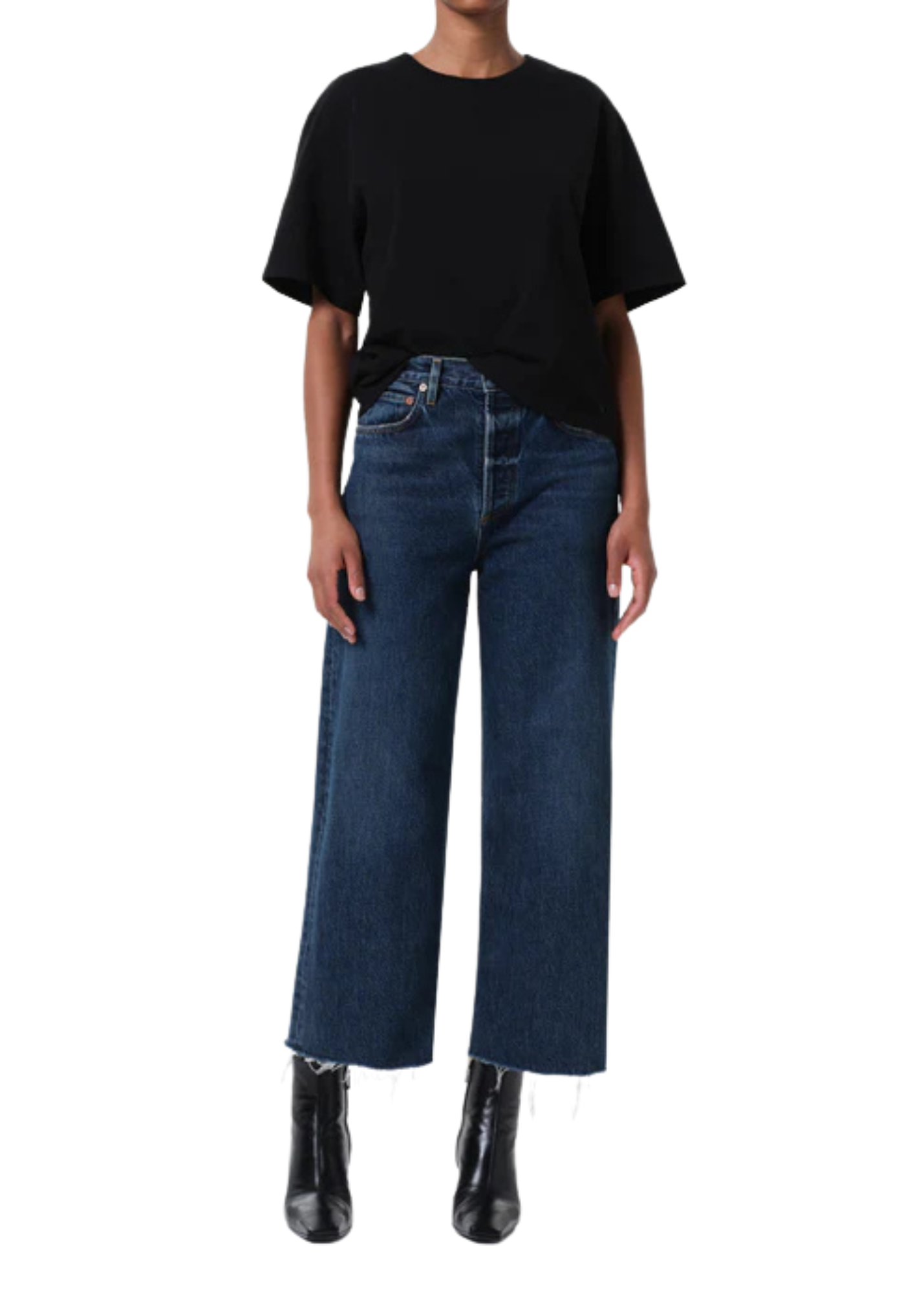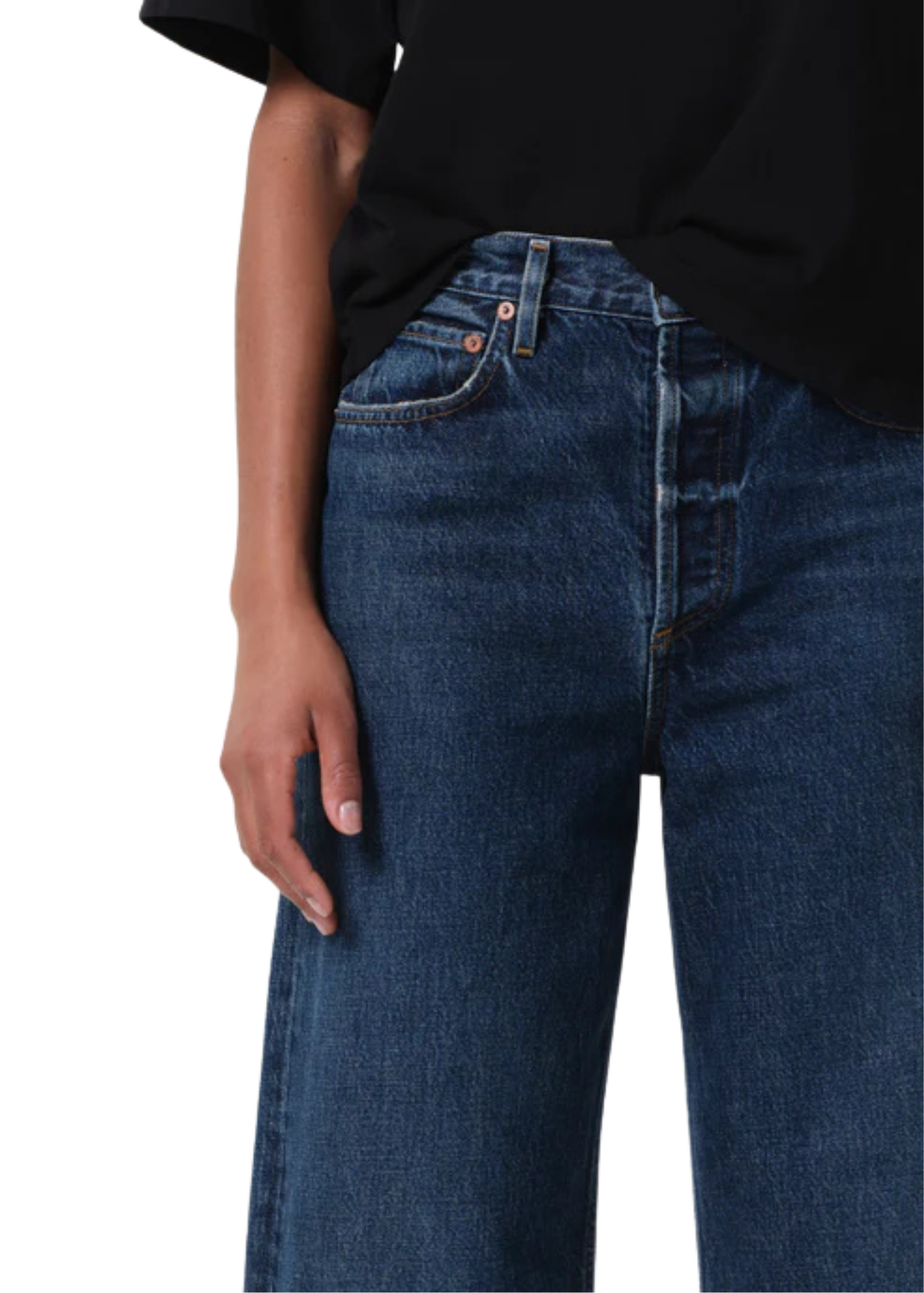 Nonstretch denim brings structure to high-rise, wide-leg jeans cast in a unique wash and finished with ankle-grazing hems.