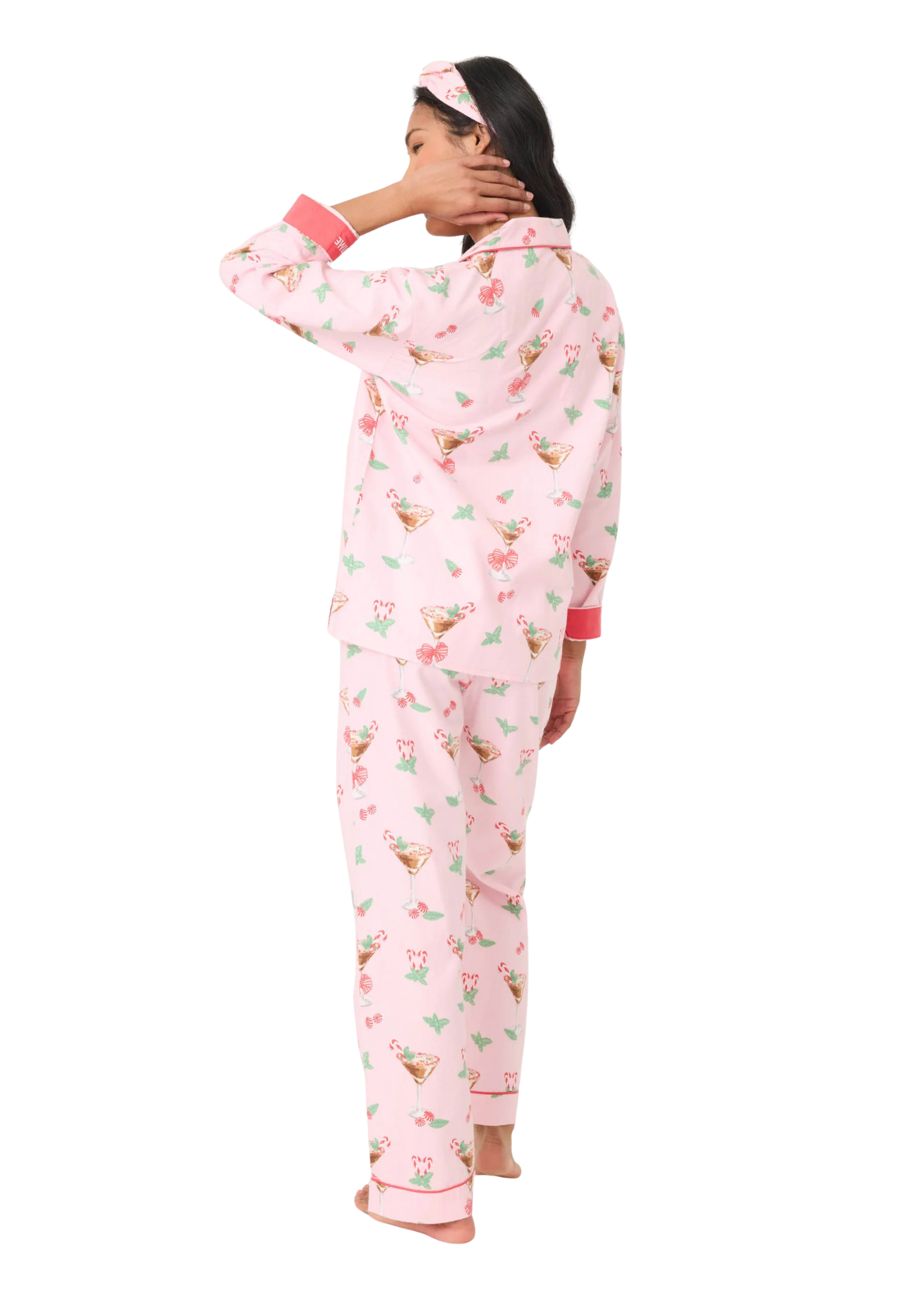 Festive and spirited, this three-piece flannel set is made from soft cotton in a classic twill weave, complete with a button-front top, relaxed drawstring pants. The blush-pink backdrop is covered in candy cane martinis, mint sprigs, and cheery little bows, finished with contrast piping and a cuff that cheekily reads “Tini Time”—made for holiday happy hours, sweet nightcaps, and drifting off afterwards.