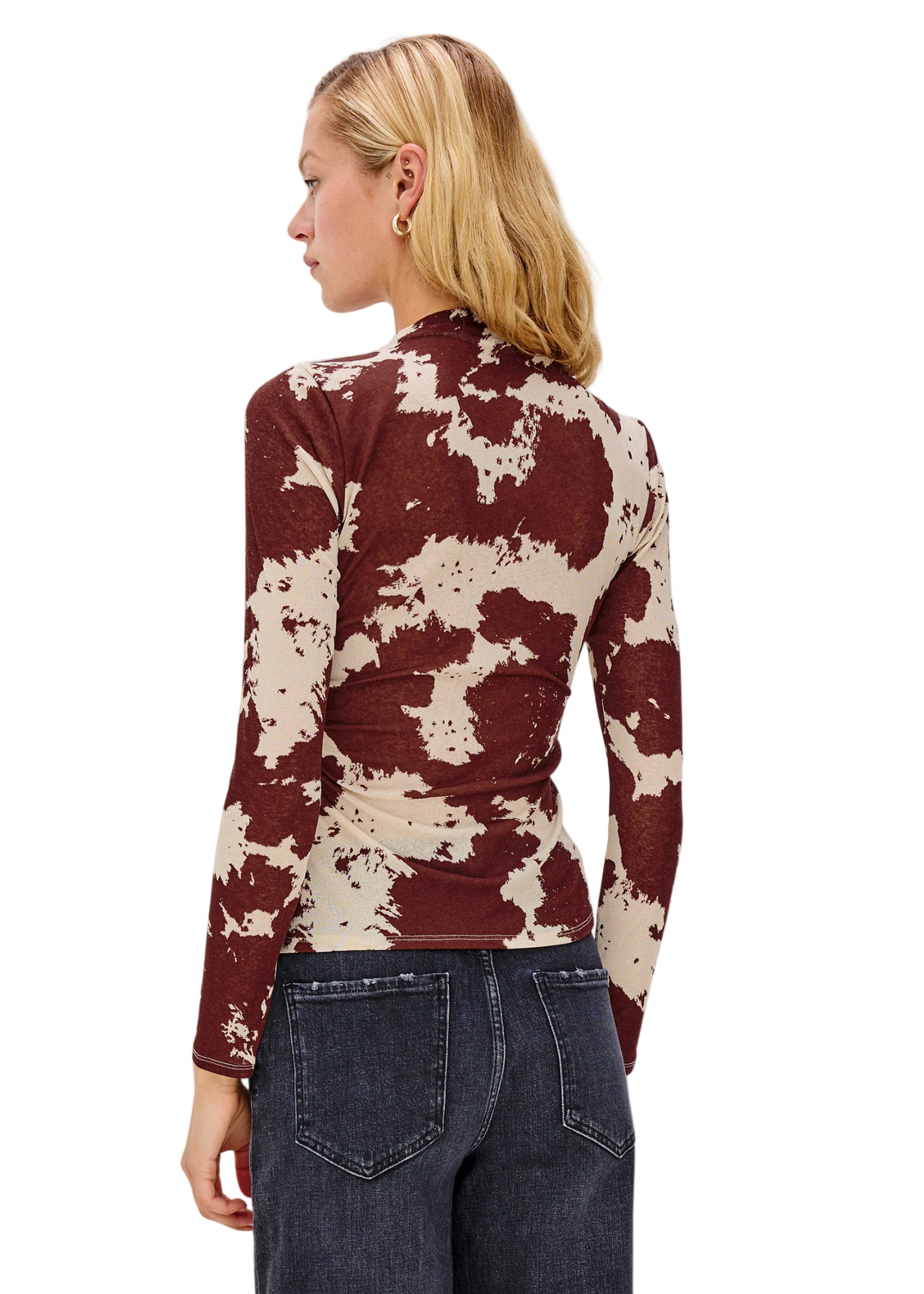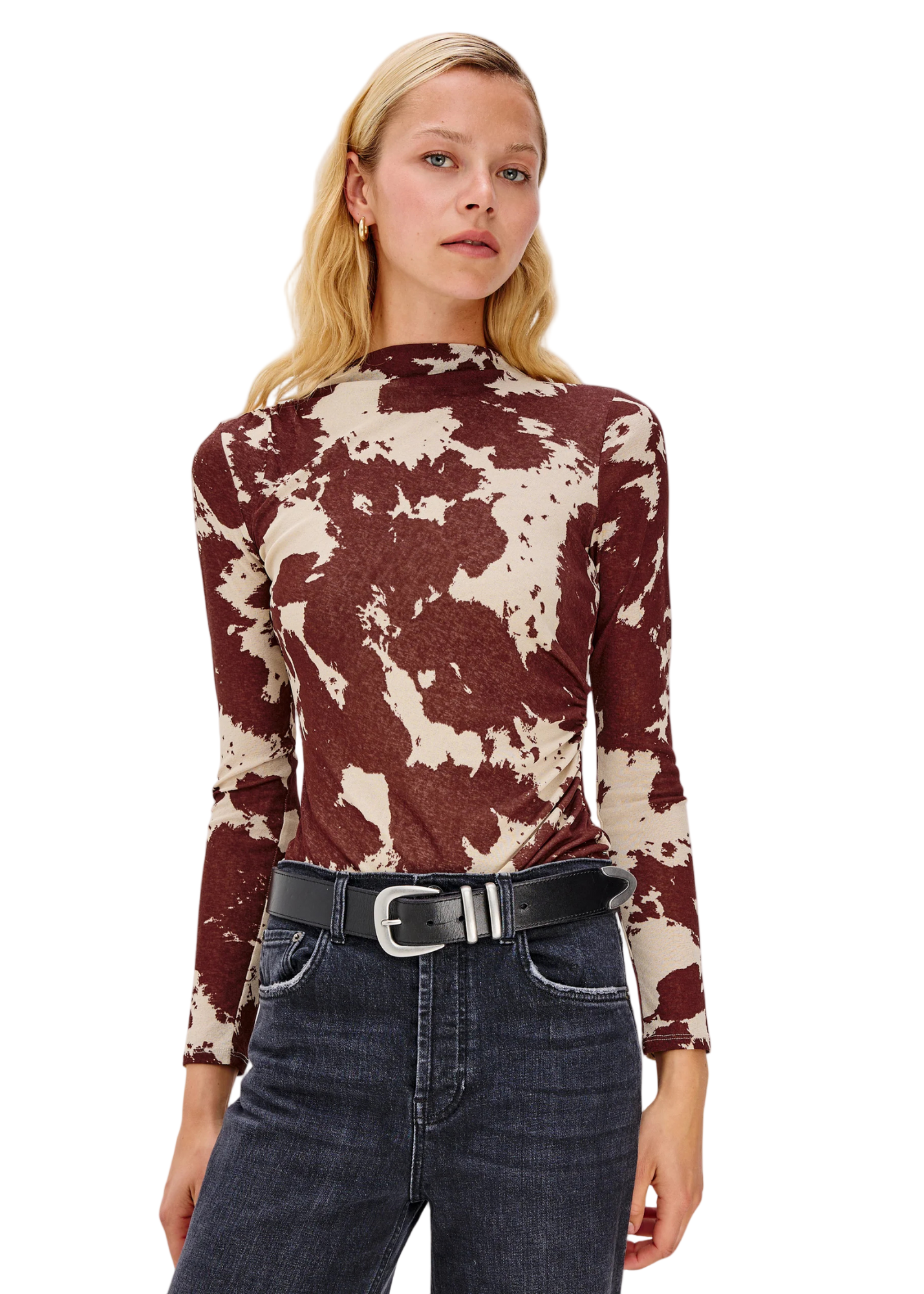 A modern take on the classic long sleeve, the Joelle top is crafted from a soft mesh fabric with an asymmetrical mock neck with shirring details from the right shoulder.