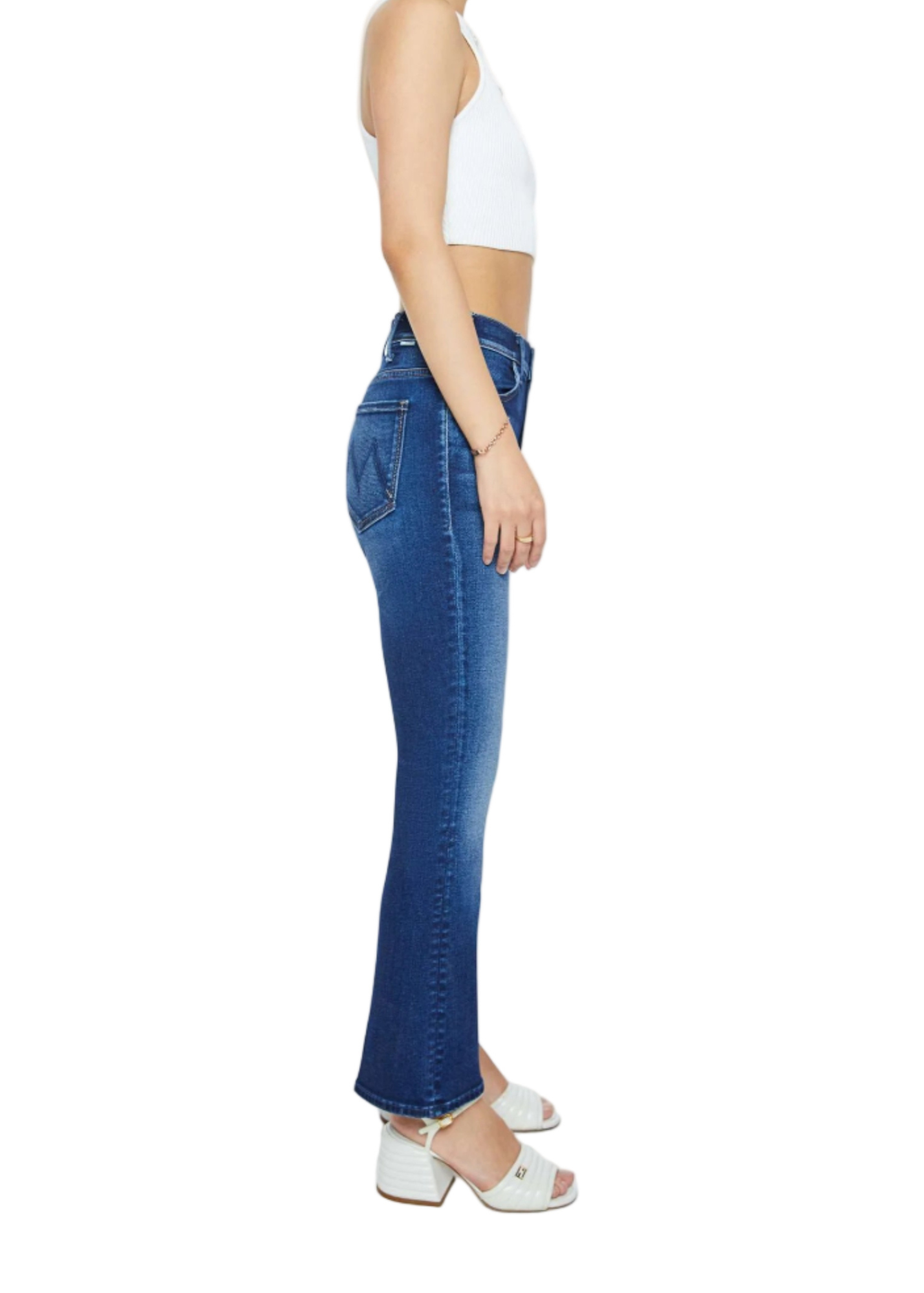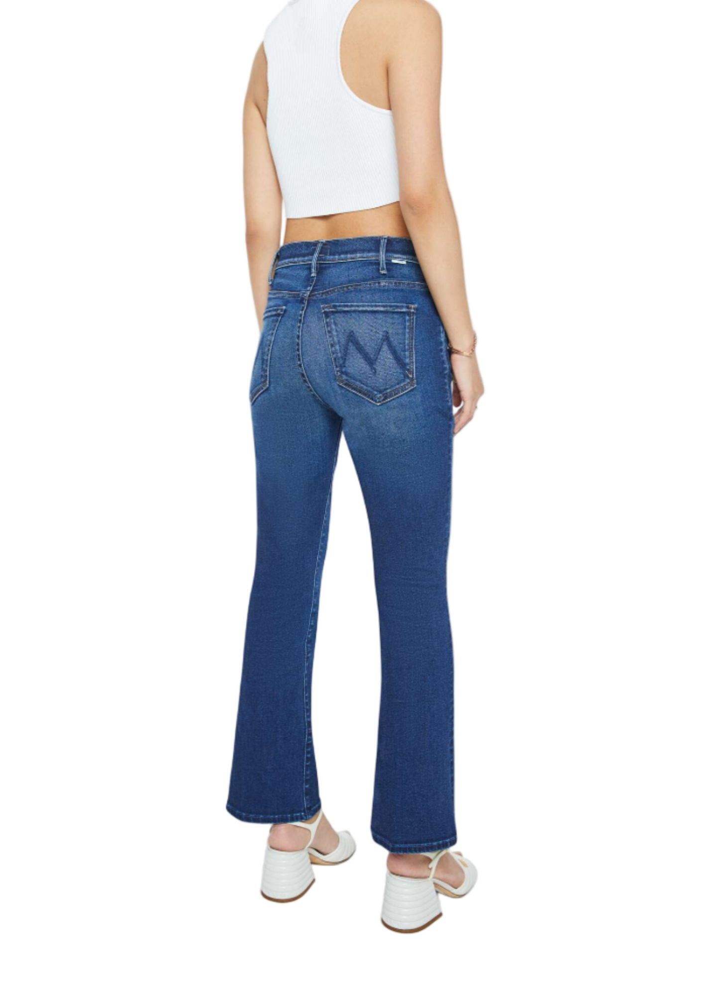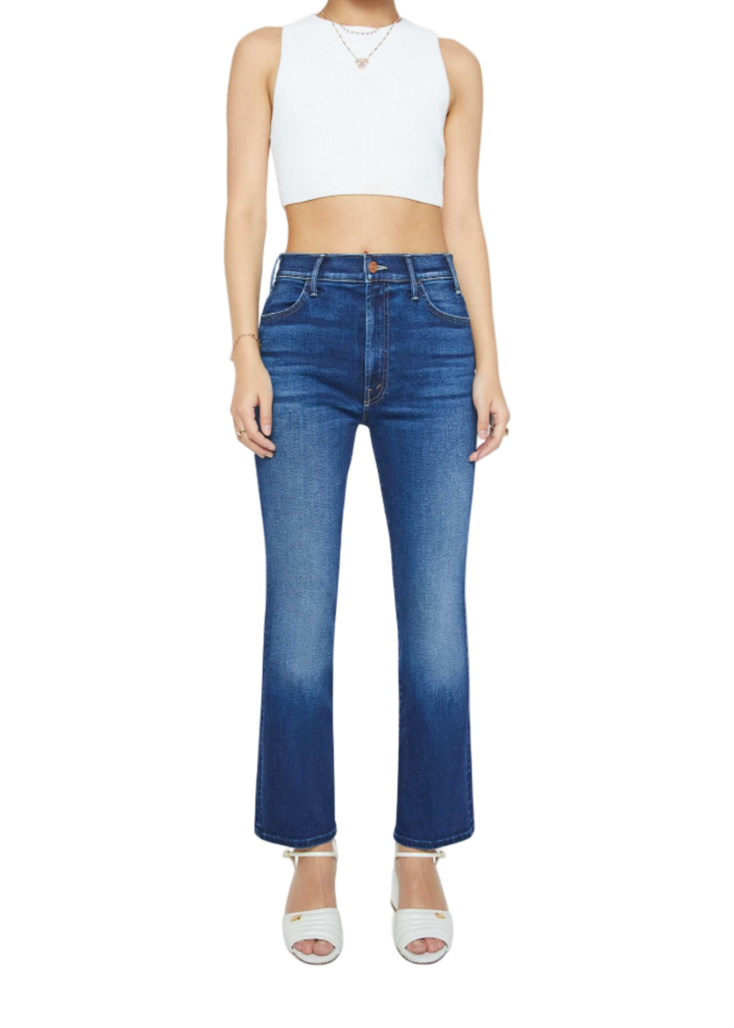 This bestselling high-rise flare has an ankle-length inseam and a clean hem. Made from stretch denim, Taking Chances is a dark blue with whiskering and fading at the knees.