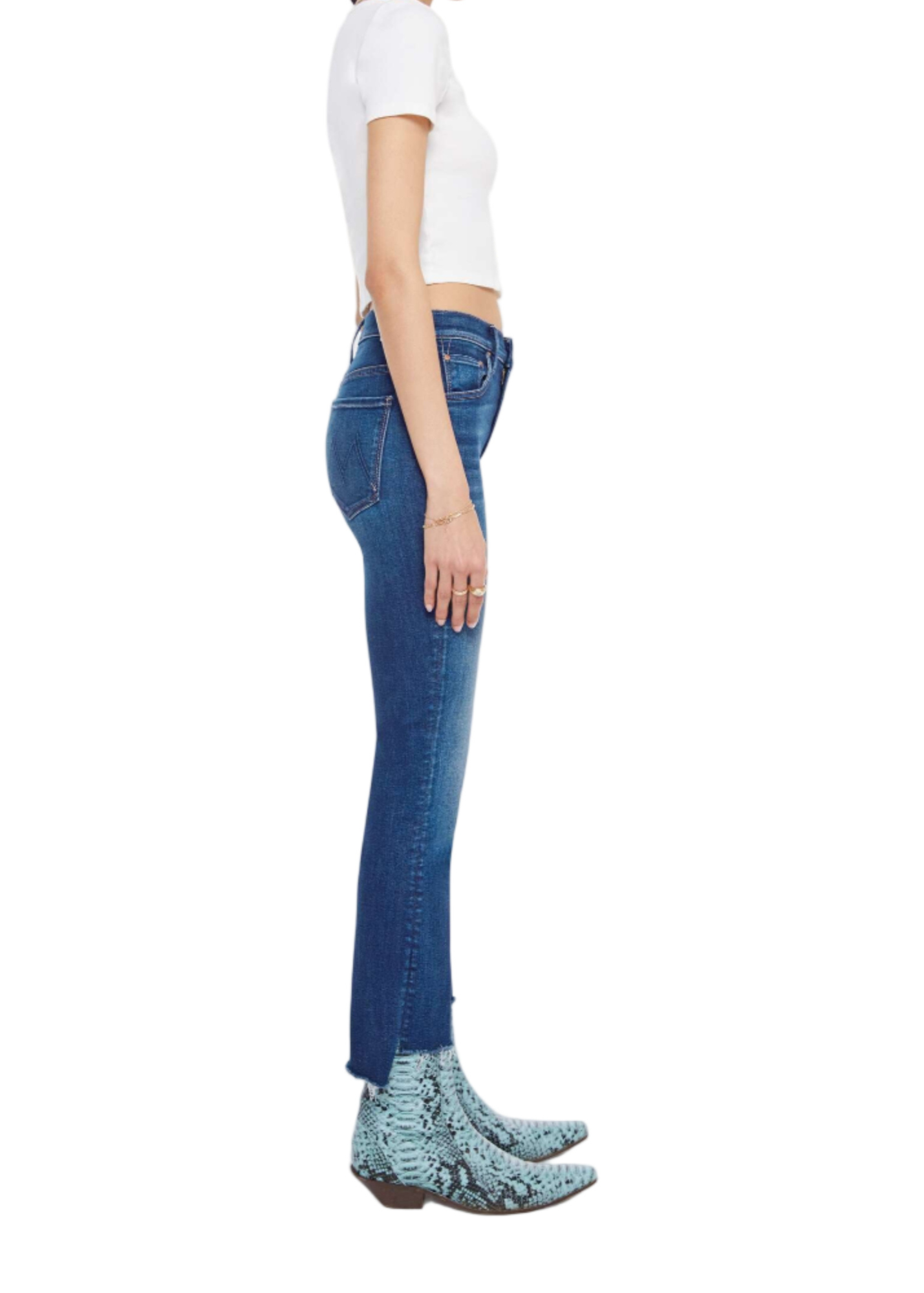 Up to no good. This iconic high-waisted bootcut has a zip fly, ankle-length inseam and a frayed step-hem. Made from a blend of recycled stretch denim, Troublemaker is a mid-blue with whiskering and fading at the knees.