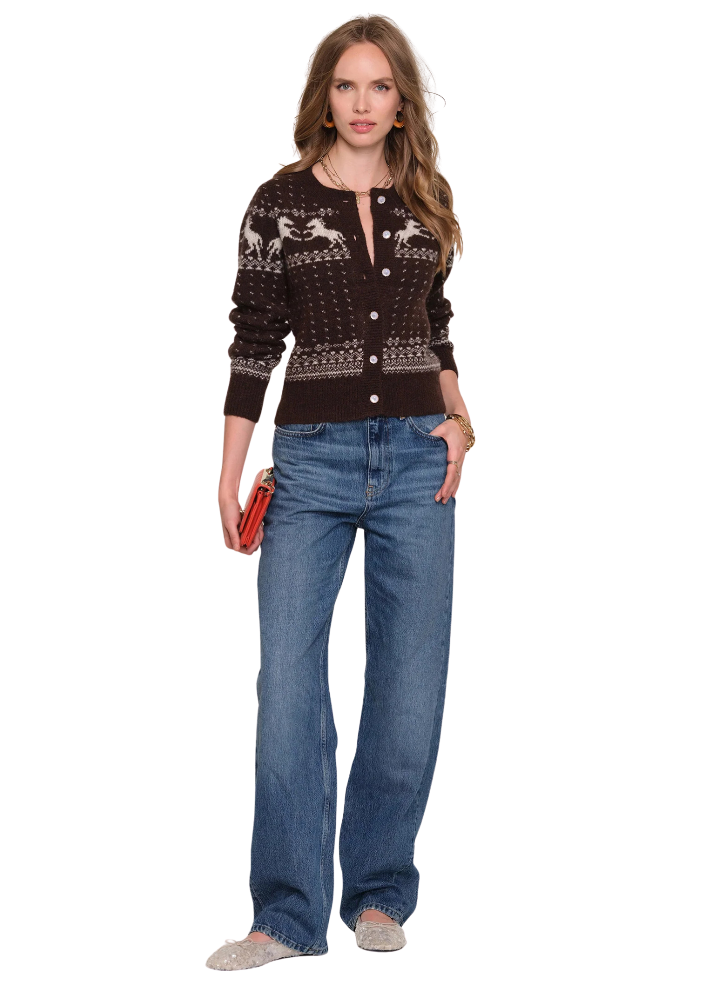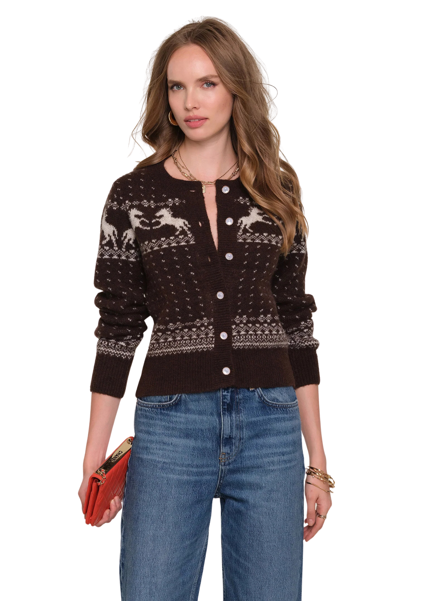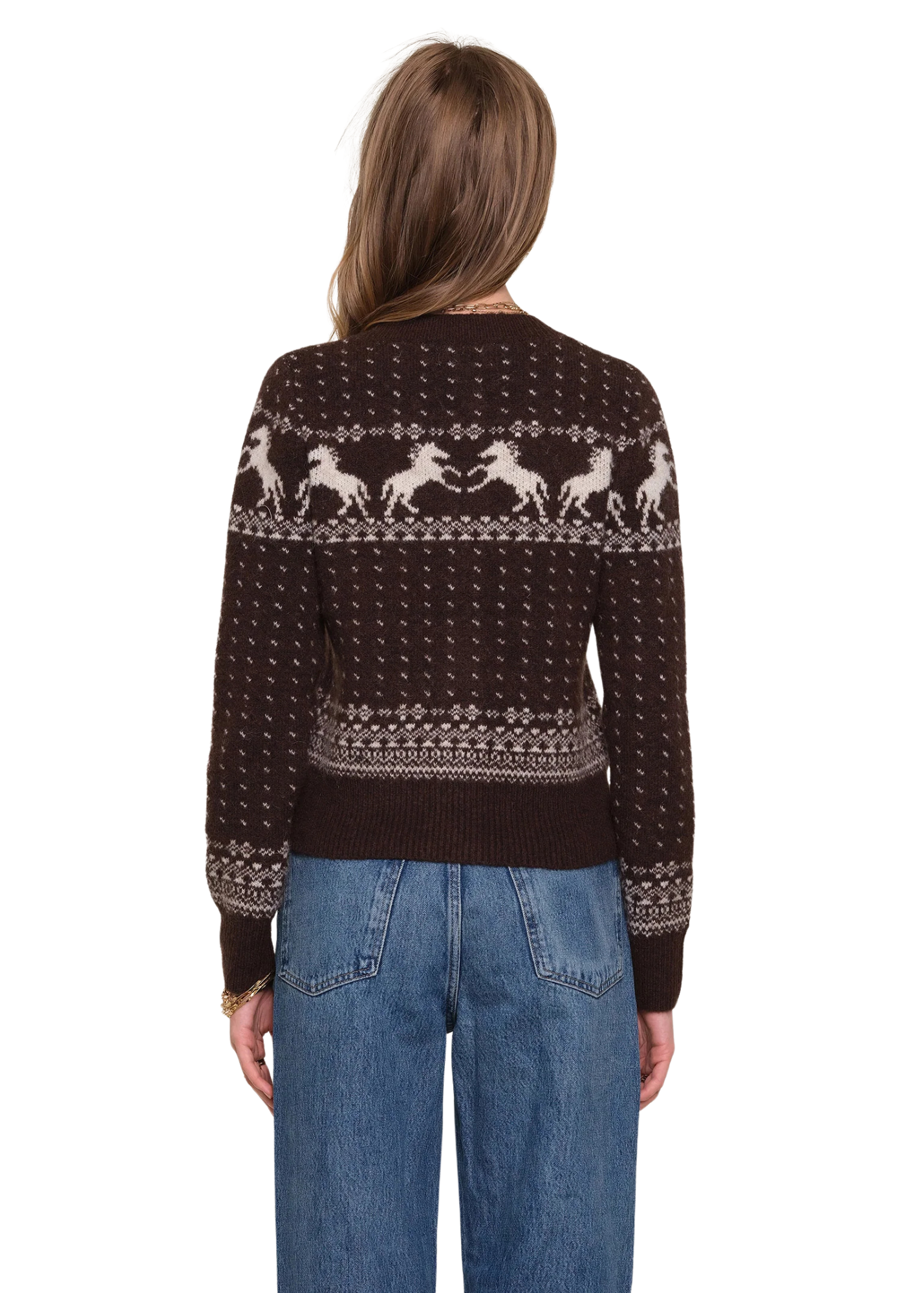 The Esti Cardi is one of our favorite sweaters of the season. It has a crew neck and a cool, relaxed fit. It features a winter jacquard pattern and cute, novelty buttons.