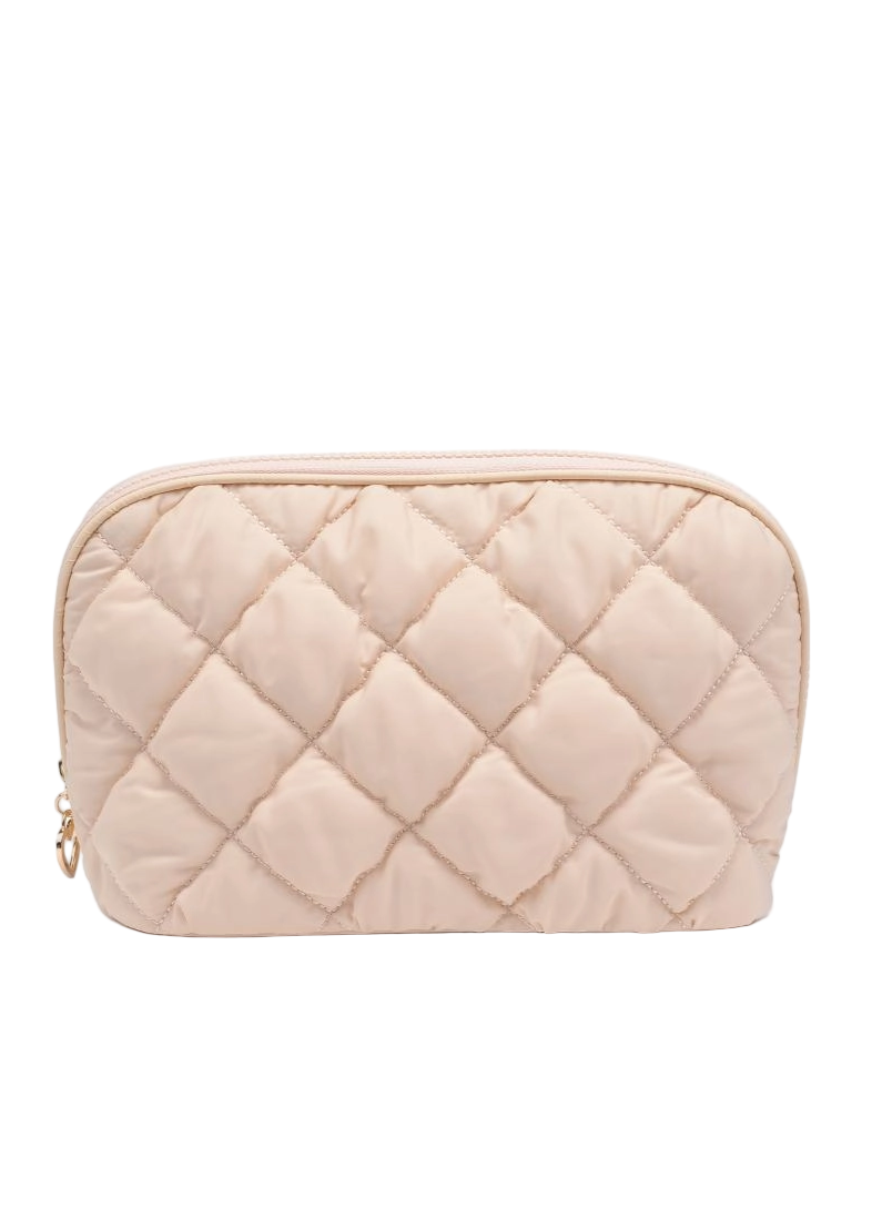 Effortlessly chic, this quilted puffer nylon cosmetic dome pouch is designed for the modern woman on the go.