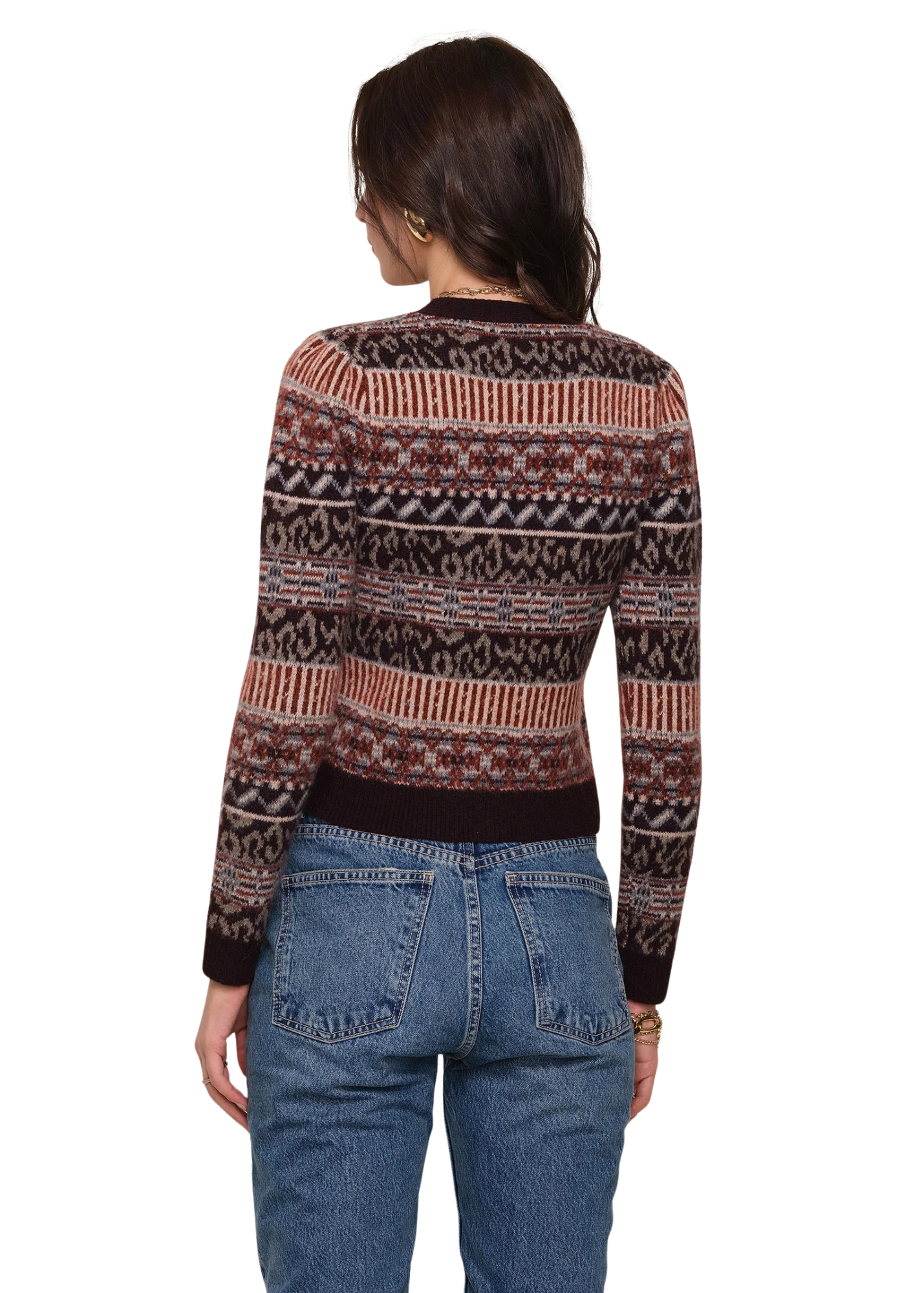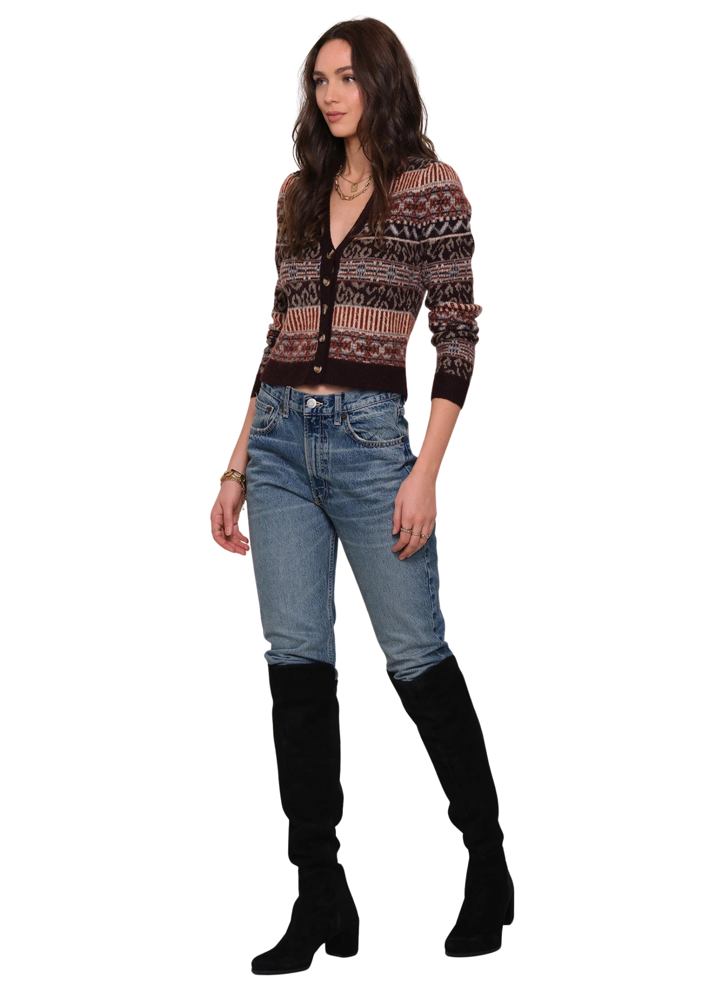 The Ruta Cardi is a cool, slim fit cardigan. It has a pretty pattern knit throughout the body that features a leopard print jacquard. It has faux horn buttons and a v-neck.