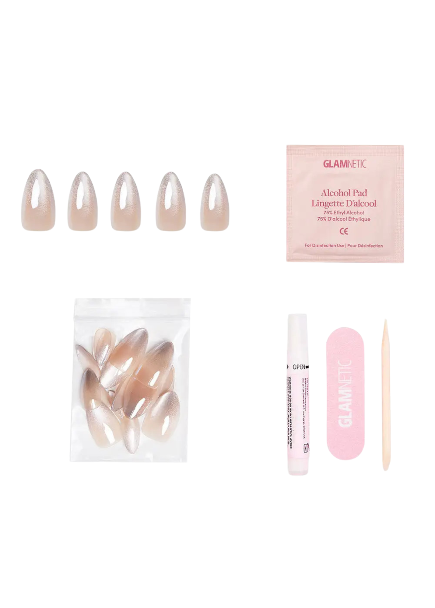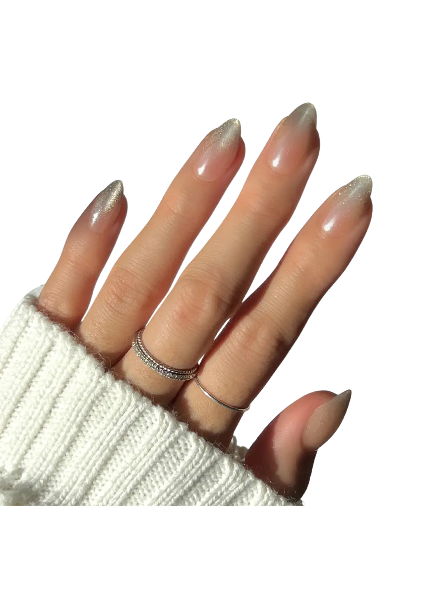 Embrace the magic of a winter wonderland with the Polar Night Nail Set. These short almond nails feature a semi-translucent base with a glossy, silver gradient velvet finish, evoking the icy beauty of a polar night.