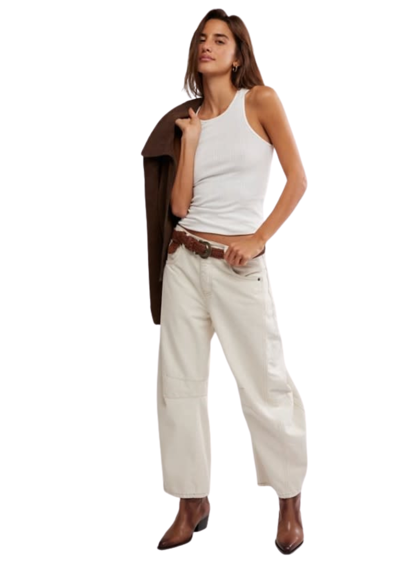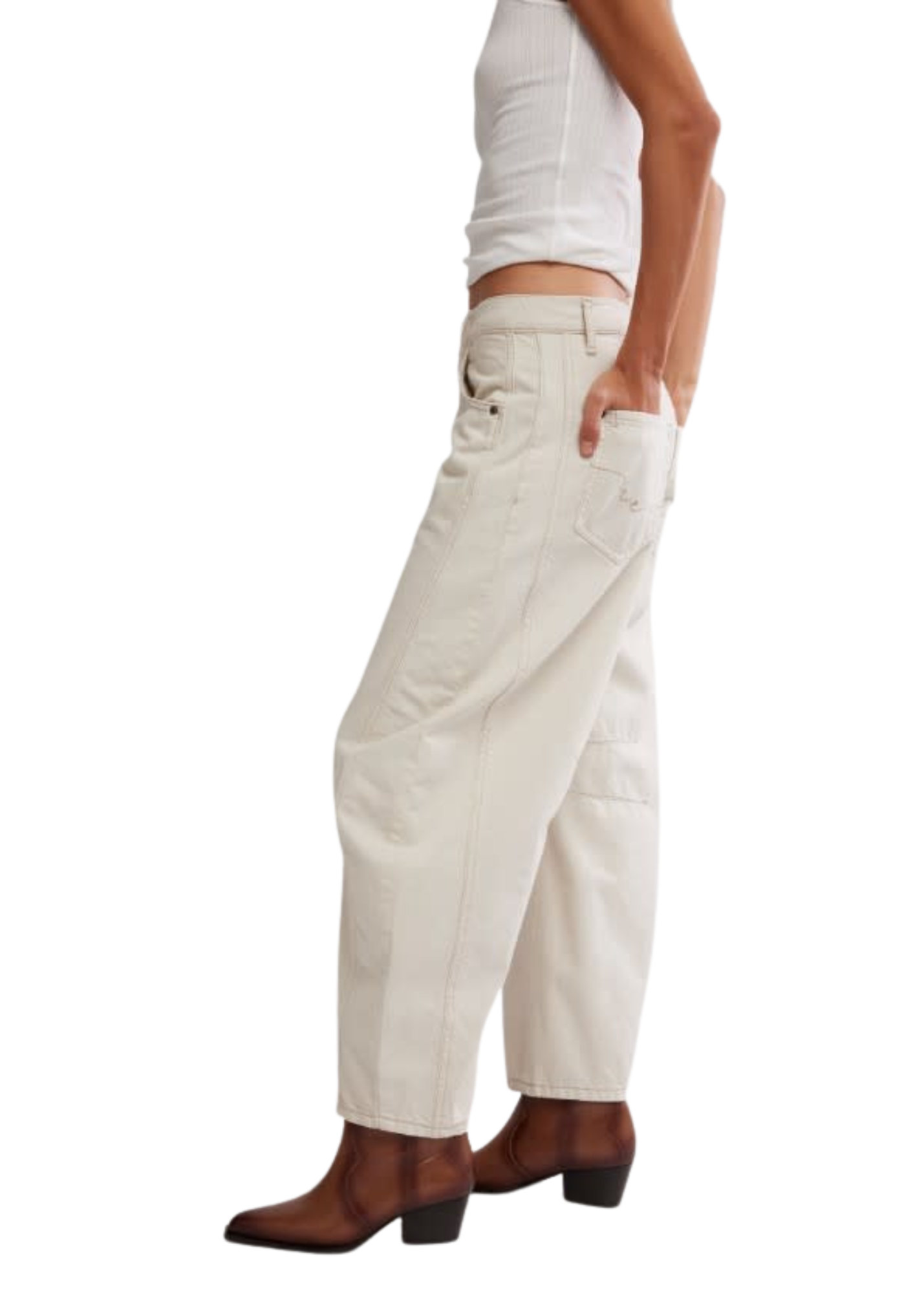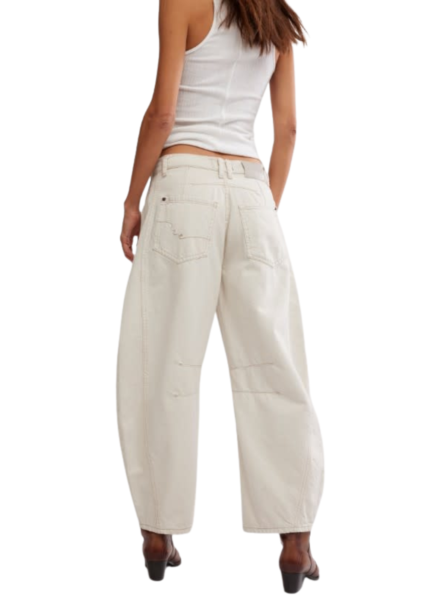 So bold barrel jeans from our We The Free collection featured in a mid-rise fit with subtle distressed detailing and wide-legs that taper at the ankle.