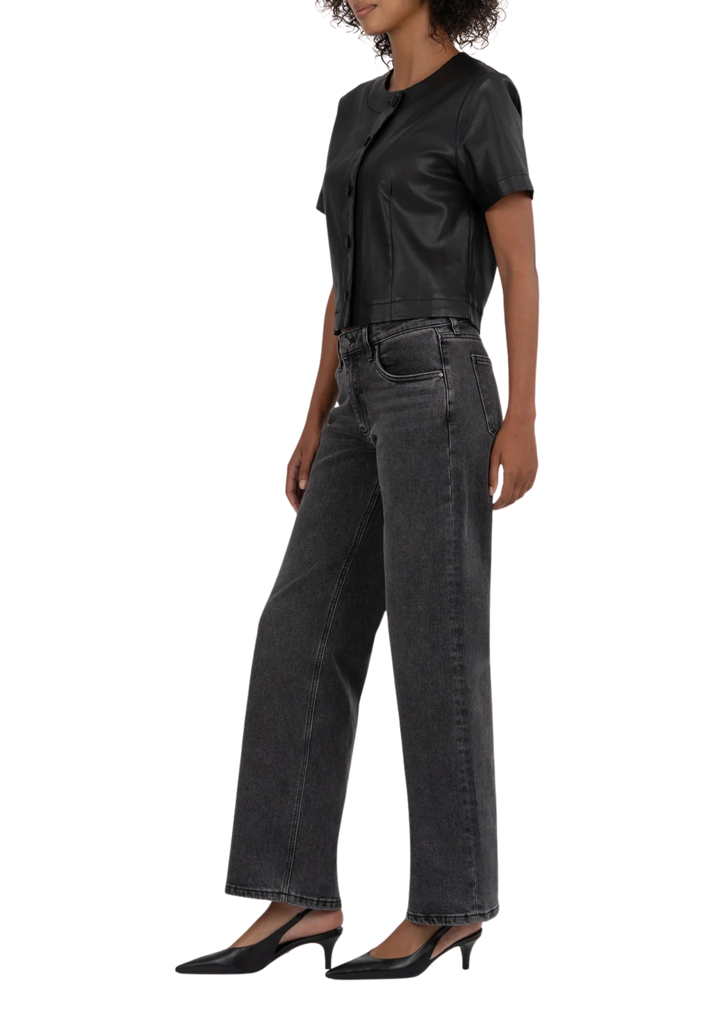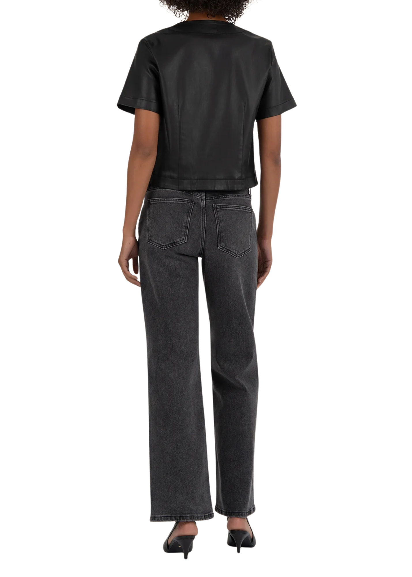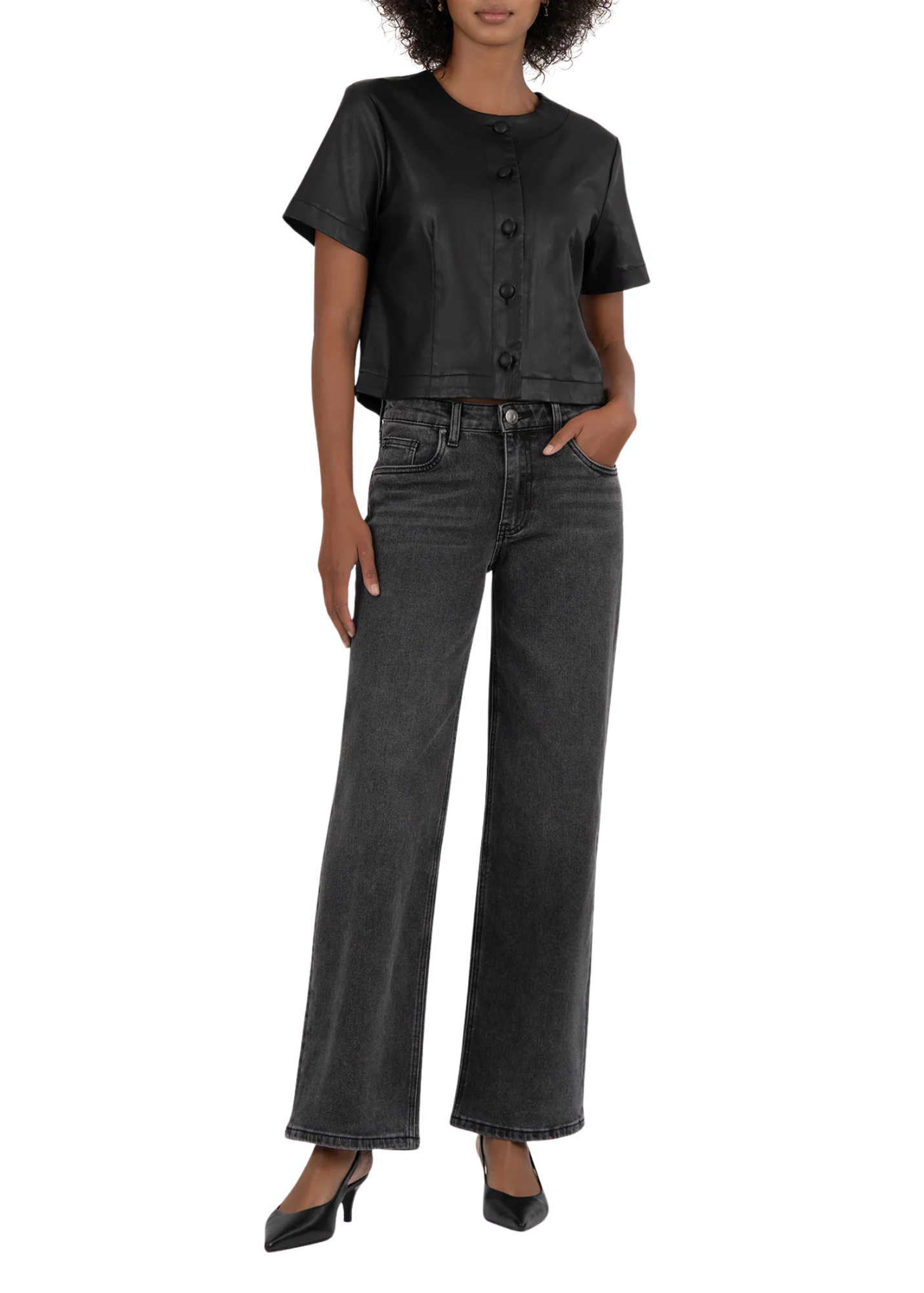 Designed with a modern coated material, this short sleeve shirt features a clean crew neck and front button closure. A versatile piece you can dress up or down, perfect for statement layering or a polished standalone look.