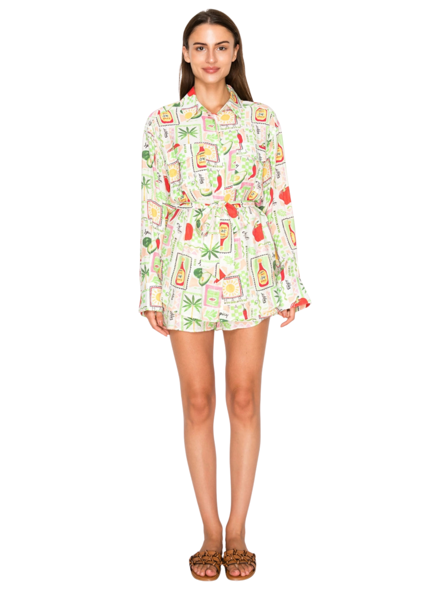 Embrace the art of playful sophistication in this stunning printed button-down. Crafted from a lightweight, breathable fabric, it features a vibrant, graphic print of chili peppers, avocados, and hot sauce bottles. Perfect for the woman who finds beauty in the everyday. The oversized, tunic-style silhouette is effortlessly chic, featuring a classic collar and long sleeves with button cuffs. Pair it with its matching shorts (sold separately) for a head-turning coordinated look, or wear it open over a swimsuit as a sophisticated beach cover-up.